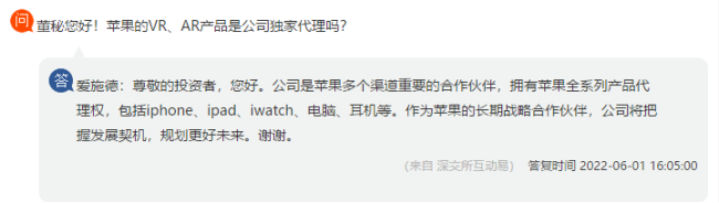 6月1日,爱施德在投资者互动平台上表示,公司是苹果多个渠道重要的合作伙伴,拥有苹果全系列产品代理权,包括iphone、ipad、iwatch、电脑、耳机等。